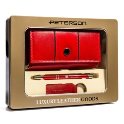 Zestaw prezentowy: skórzany portfel damski na zatrzask, brelok i czerwony długopis - Peterson