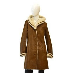 Skórzany Kożuch damski z kapturem na guziki ciepły przed kolano Bukowski