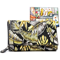 Rovicky Pojemny skórzany portfel damski na zatrzask roślinny wzór