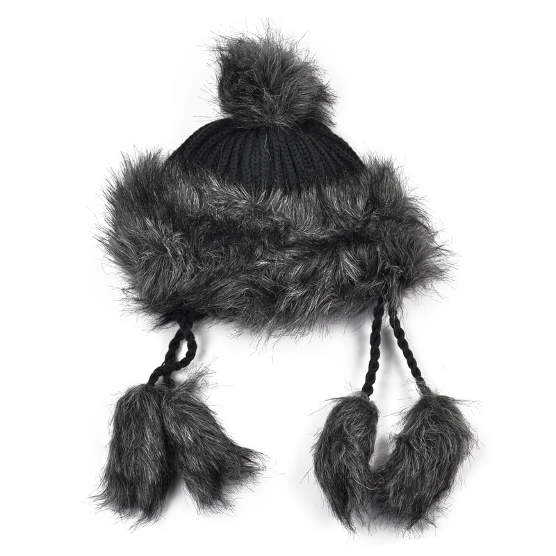 Ozdobiona pomponem oraz futrzastymi frędzlami na sznurkach.