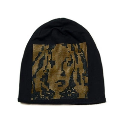 Ozdobiona złotymi i czarnymi dżetami, które układają się w kształt kobiecej twarzy.