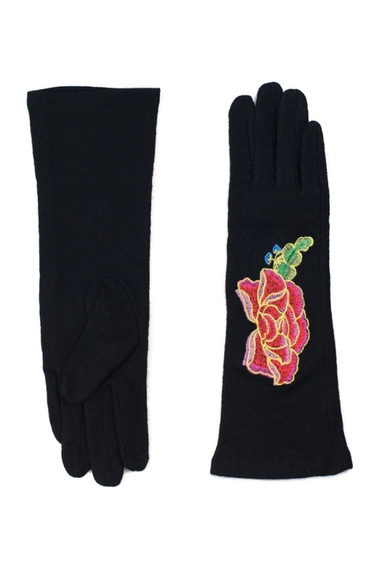 Jedna rękawiczka jest gładka, druga ozdobiona haftowanym kwiatem.