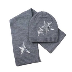 Czapka i szalik ozdobione są gwiazdkami wykonanymi z cekinów.