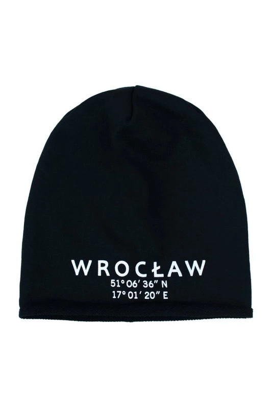 Czapka z nadrukiem nazw największych polskich miast wraz z współrzędnymi,