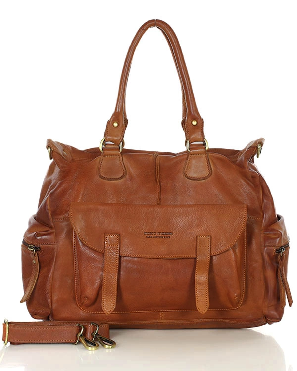 Opinie o Pojemna torba damska na ramię z kieszeniami skóra naturalna - MARCO MAZZINI brąz camel