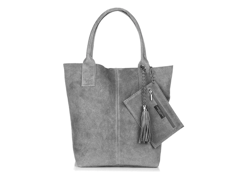 - Szara shopperka z saszetką została wyprodukowana we Włoszech z wysokiej jakości zamszowej skóry naturalnej