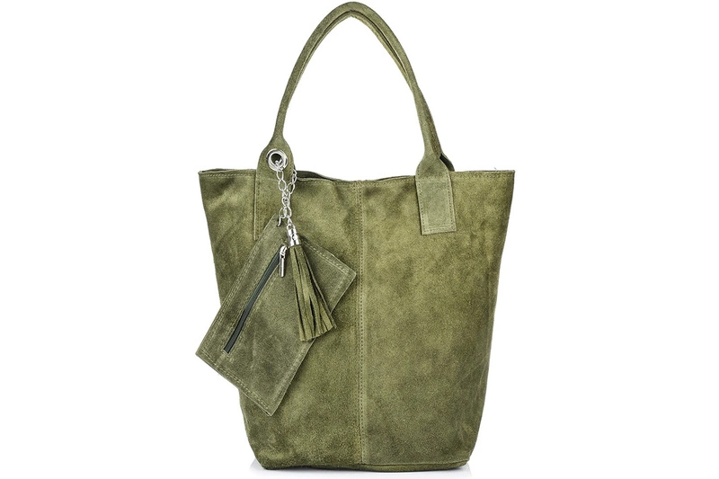 Opinie o Torebka skórzana zamszowa WOREK duża A4 Z SASZETKĄ oliwkowa L82