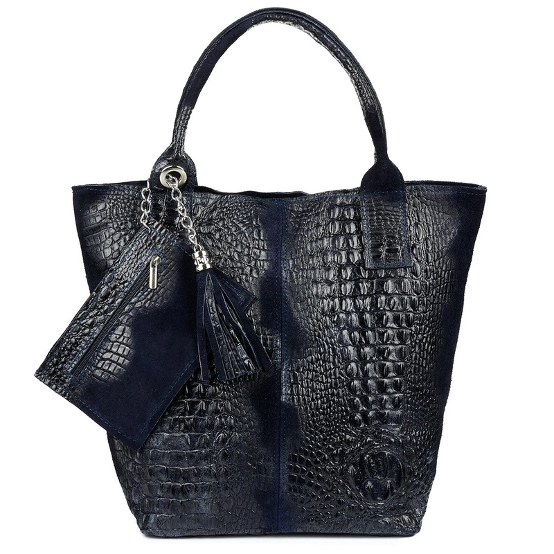 GRANATOWA DUŻA SKÓRZANA SHOPPERKA SKÓRA KROKODYLA TORBA WOREK Z SASZETKĄ L94