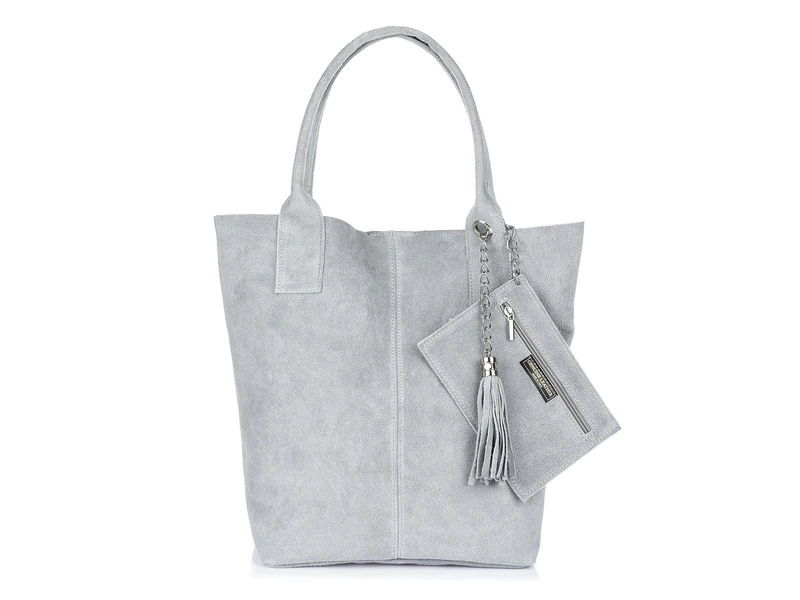 Opinie o Torebka skórzana zamszowa WOREK duża A4 Z SASZETKĄ jasnoszara L82