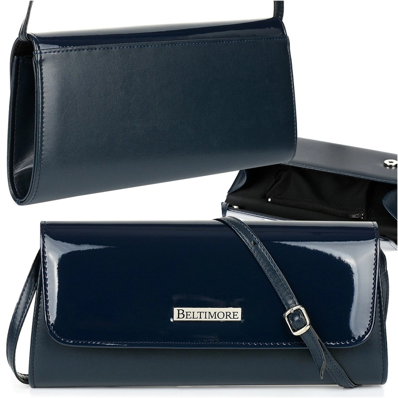 Torebka jest w połowie lakierowa i matowa w kolorze granatowym, front torebki zdobi logo polskiej marki BELTIMORE.