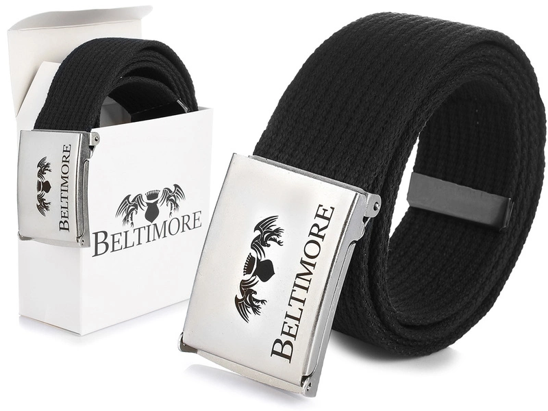 Męski, uniwersalny, parciany pasek marki Beltimore z możliwością regulacji długości w eleganckim, czarnym kolorze.