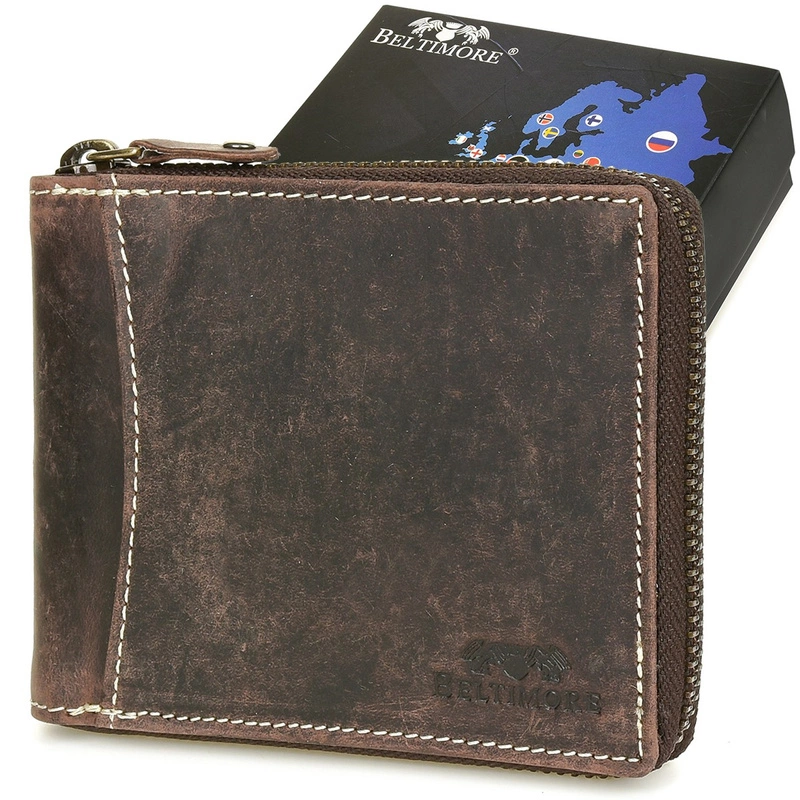 Portfel skórzany zasuwany duży poziomy RFiD nubuk brąz Beltimore H01