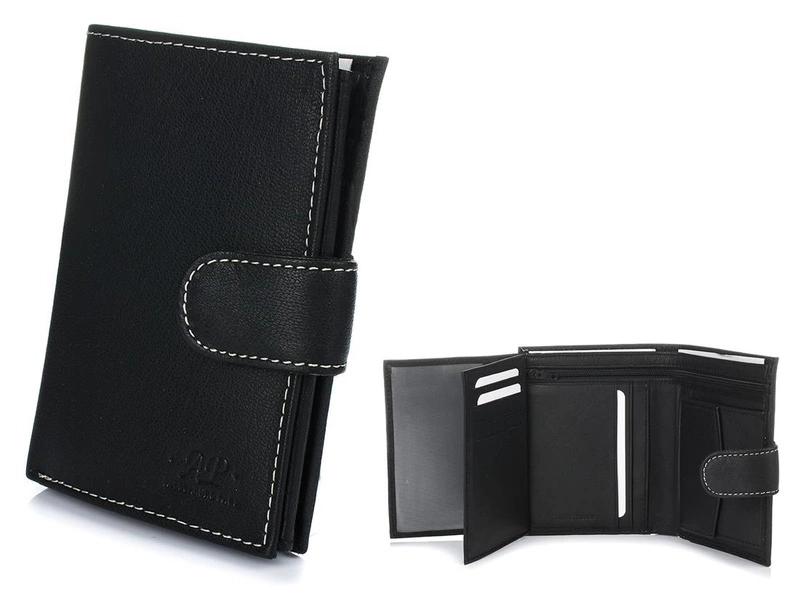 Portfel ten jest w pionowej orientacji, dodatkowo z zewnętrzną zapinką. Portfel rozkłada się szeroko i ma dużo przegród na karty, są też specjalny schowek na dodatkowe rzeczy lub bilon i dwie, duże przeźroczyste kieszenie na dowód rejestracyjny i zdjęcia.
