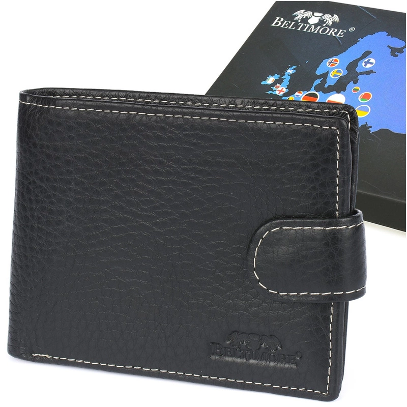 Portfel męski skórzany czarny poziomy z zapinką pojemny Beltimore RFiD I46