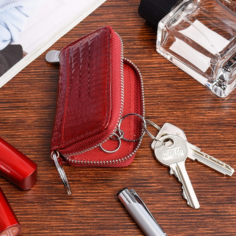 Czerwone skórzane etui na klucze damskie pojemne lakier F19