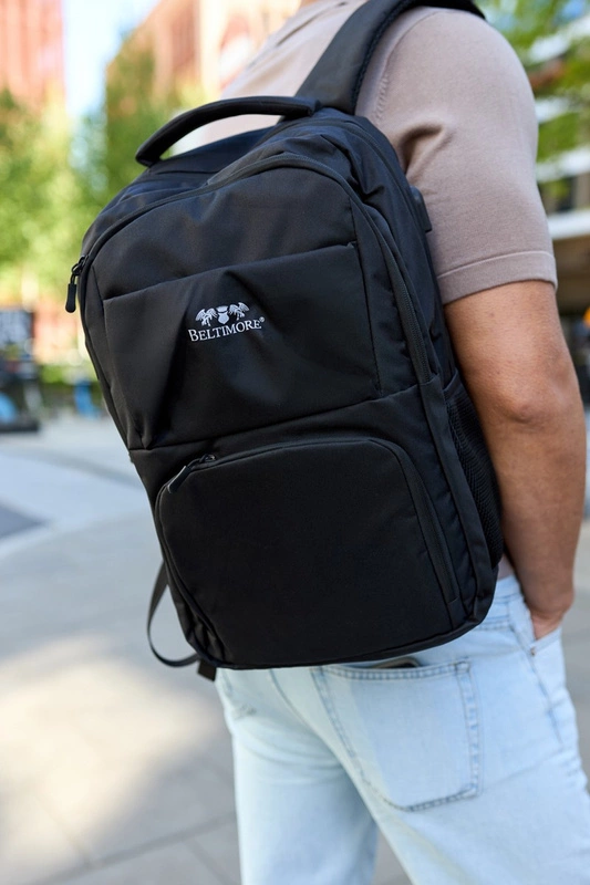 Profesjonalny dwukomorowy plecak na laptopa premium marki Beltimore® ze specjalnym przedłużaczem USB na power bank.