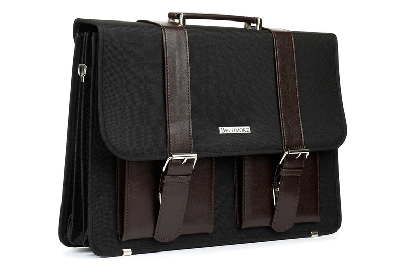 Elegancka, pojemna męska aktówka marki Beltimore. Teczka, neseser do pracy wykonana z wysokiej jakości syntetyku i skóry ekologicznej. W kolorze czarnym z brązowymi wstawkami z eko skóry.