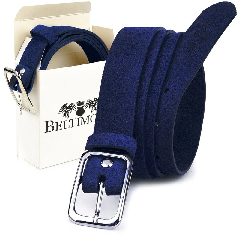 Damski pasek ze skóry naturalnej zamszowej wysokiej jakości w granatowym kolorze.