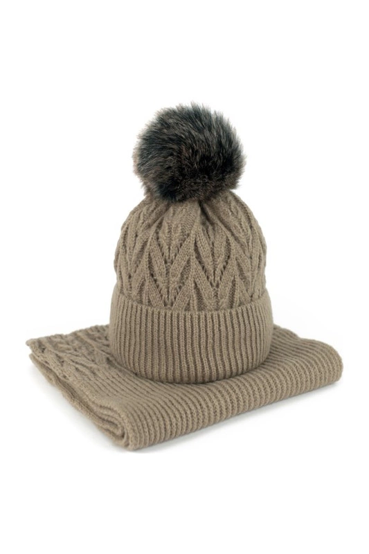Czapkę zdobi duży pompon ze sztucznego futerka i klasyczny zimowy wzór.
