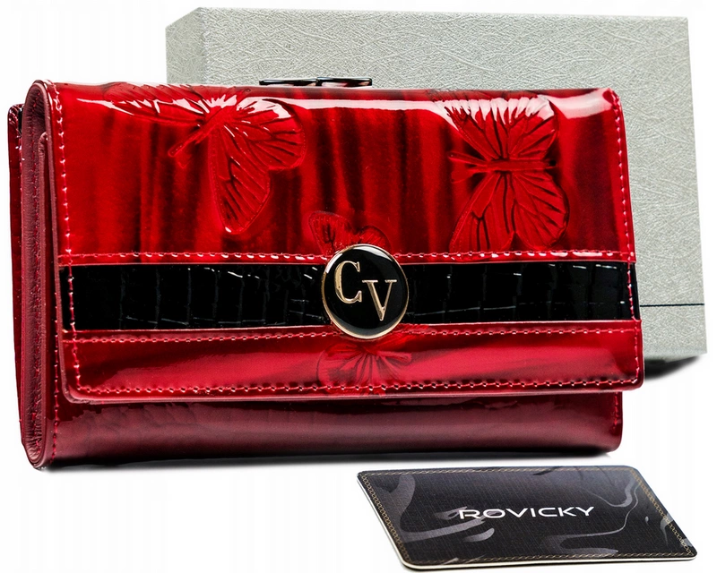 - Portfel z klapą na zatrzask. Wykonany z lakierowanej skóry naturalnej pokrytej tłoczeniem z motylami. Na froncie logo marki Cavaldi. Wewnątrz przestronna sekcja na karty i dokumenty. Portmonetka zewnętrzna zamykana biglem. Portfel zapakowany w pudełko.