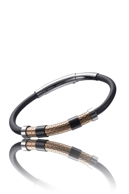 Wyjątkowym akcentem bransoletki są stalowe elementy, które dodają jej eleganckiego i nowoczesnego wyglądu. Stalowe detale stanowią kontrast z elastycznym materiałem, nadając bransoletce wyrazisty, męski charakter. Te elementy podkreślają solidność i wysoką jakość wykonania biżuterii.