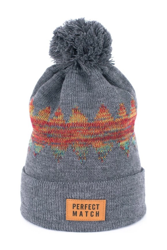 Komfortowa czapka z pomponem. Ozdobiona kolorową aplikacją oraz naszywką z ekoskóry z napisem "Perfect match".
