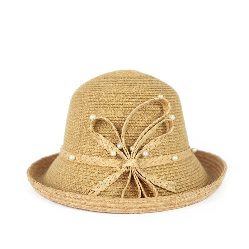 Zgrabny kapelusz letni ozdobiony tasiemką i perełkami.