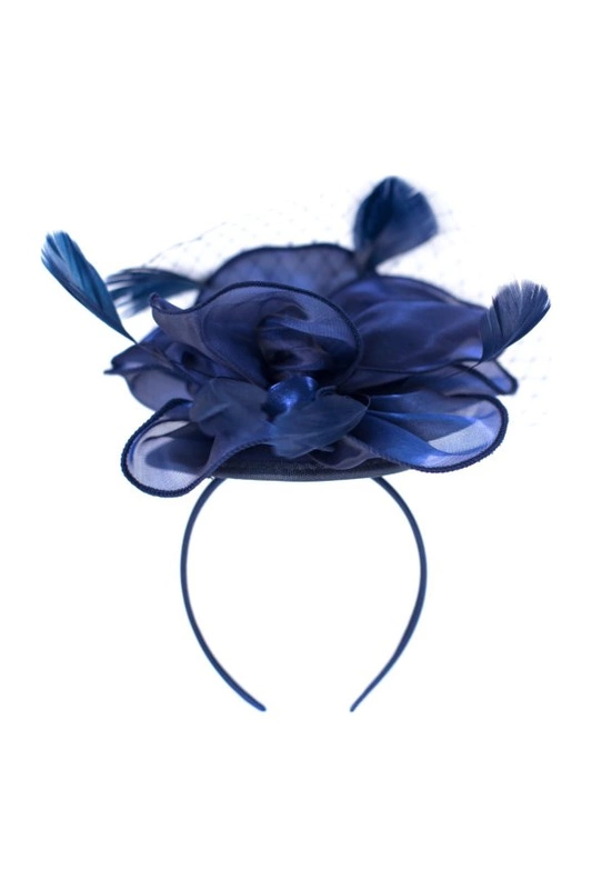Ozdobiony fantazyjną kokardą i naturalnymi piórami.