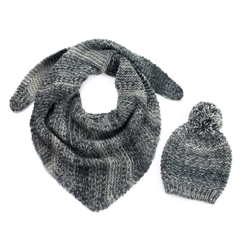 Czapka z pomponem wykonanym z włóczki. Chusta o trójkątnym kształcie.