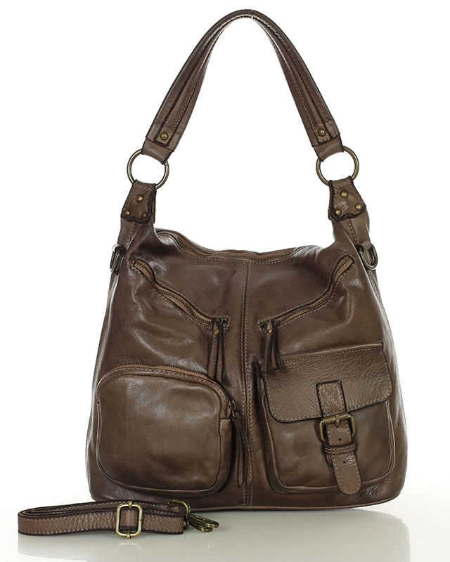 - Skórzana torebka na ramię z praktycznymi kieszonkami. Wykonana z naturalnej skóry