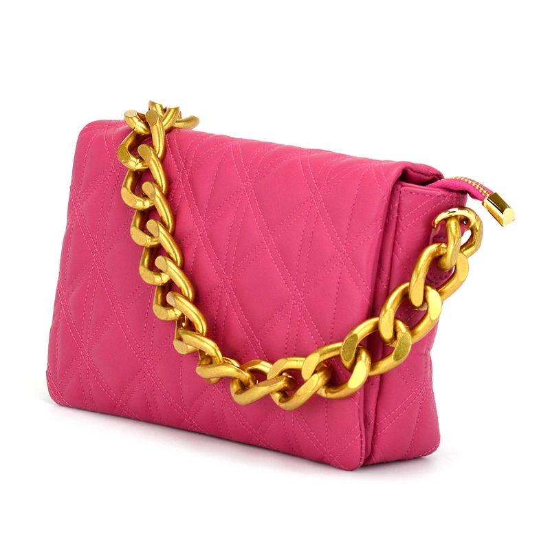 Damska torebka w fasonie listonoszki, kopertówki. Oryginalna, pikowaną faktura ze złotym zdobieniem. Całość zamykana na podwójne zamknięcie, klapa na magnes oraz na suwak. Przez co zwiększone jest bezpieczeństwo przechowywania. Uchwyt w typie łańcucha, przykuwa swoją uwagę i wyróżnia ten model na tle innych torebek.