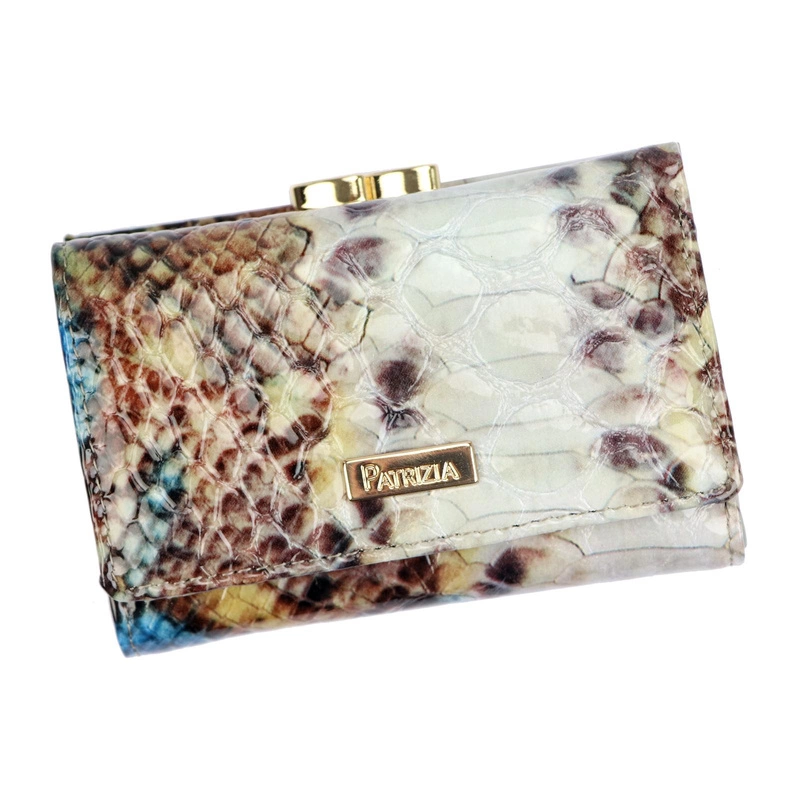 - Marka Patrizia prezentuje elegancki, poziomy portfel damski o klasycznej, podłużnej formie. Wykonany z wysokiej jakości skóry naturalnej, przyciąga uwagę subtelnym wzorem imitującym skórę węża oraz złotymi detalami, które nadają mu szyku.