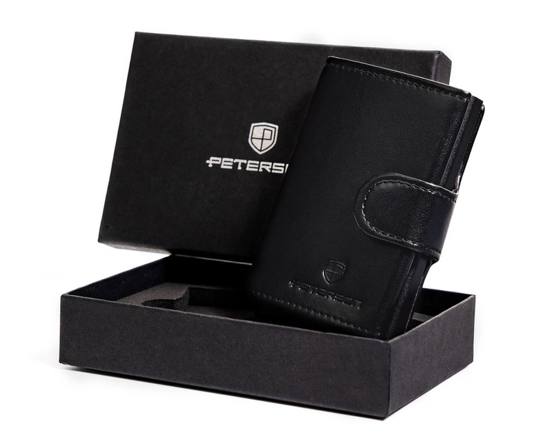 - Elegancki, kompaktowy portfel męski z wysokojakościowej skóry ekologicznej. Zamykany klasyczną zapinką z zatrzaskiem. Akcesorium z podajnikiem kart i wizytówek. Zabezpieczone antykradzieżowym systemem RFID Stop. Zapakowane w markowe pudełko Peterson.