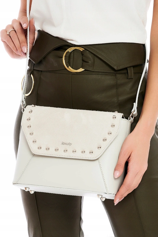- Pudełkowa, charakterna listonoszka damska. Uszyta z wysokiej jakości skóry naturalnej oraz zamszu, wykończona metalowymi nitami na klapce. Zamocowana na długim, regulowanym pasku bez możliwości odpięcia. Wewnątrz kieszonka na suwak.