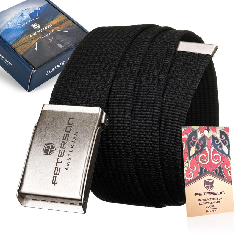 - Codzienny, wygodny parciany pasek męski. Zakończony mocną, metalową klamrą ozdobioną logo marki Peterson. Akcesorium zapakowane w markowe, kartonowe pudełko prezentowe.