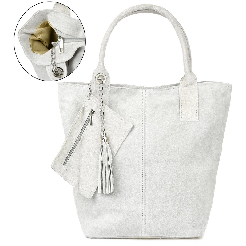 Włoska, skórzana, zamszowa torebka w stylu shopper w oryginalnym, jasno-szarym kolorze!