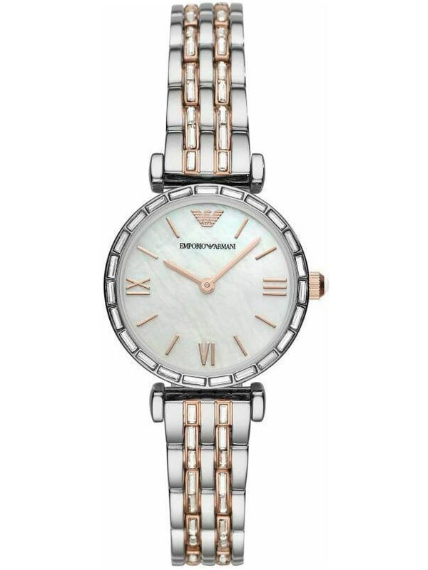 Damski zegarek Emporio Armani AR290 to stylowy damski zegarek idealny zarówno na specjalne okazje, jak i do noszenia na co dzień. Koperta oraz bransoleta zostały wykonane ze stali szlachetnej co gwarantuje wieloletnią odporność na zniszczenie. Bransoleta posiada elementy w kolorach srebrnym i różowego złota. Model posiada dokładny mechanizm kwarcowy zasilany baterią. Tarczę w kolorze perłowym z fakturą macicy perłowej zabezpiecza odporne na zarysowania szkło mineralne.