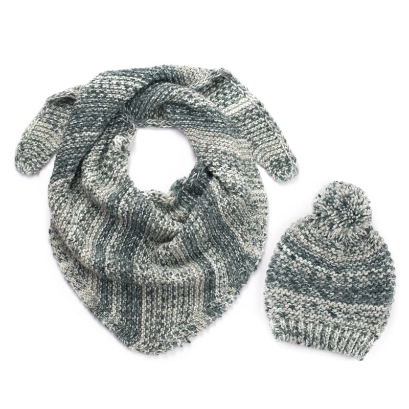 Czapka z pomponem wykonanym z włóczki. Chusta o trójkątnym kształcie.