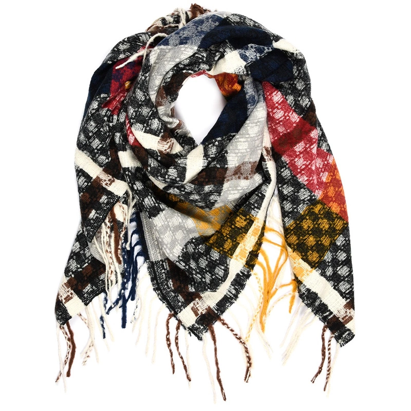 Modny, duży, przyjemny w dotyku szalik damski z oryginalnym wzorem w kratę i frędzlami