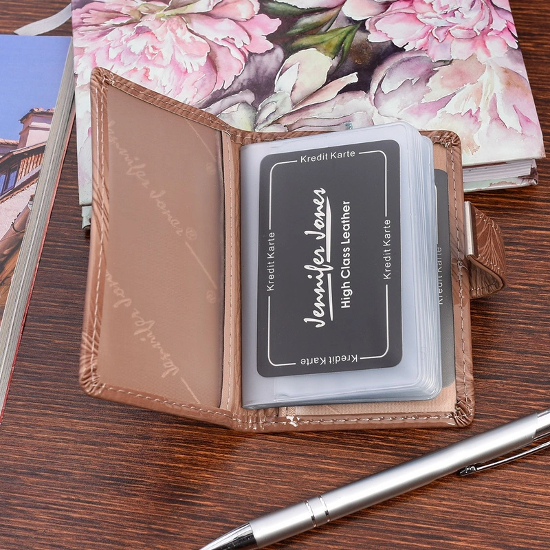 W środku jest 16 przezroczystych, pojedynczych kieszonek na wizytówki lub karty,