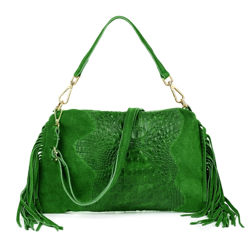 Zielona damska włoska skórzana torebka frędzel pozioma Z24
