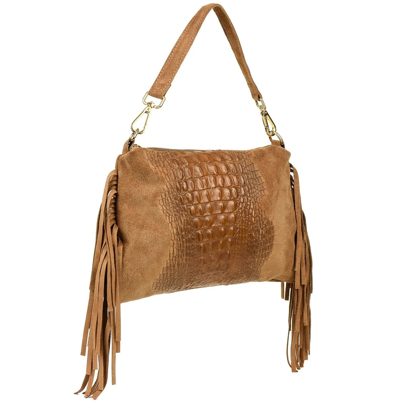Beżowa damska włoska skórzana torebka frędzel pozioma Z24