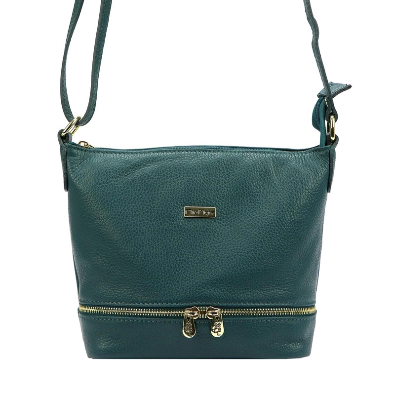• Modna skórzana torebka marki MiaMore. Lekki i wygodny model zamykany z góry na zamek. Listonoszka o średnich rozmiarach będzie idealnym dodatkiem na co dzień. Złote okucia sprawiają, że torebka prezentuje się elegancko i szykownie.