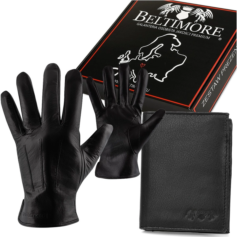 Ekskluzywny, wysokiej jakości, zestaw męski składający się ze skórzanego portfela oraz rękawiczek męskich w czarnym kolorze, zestaw marki Beltimore®