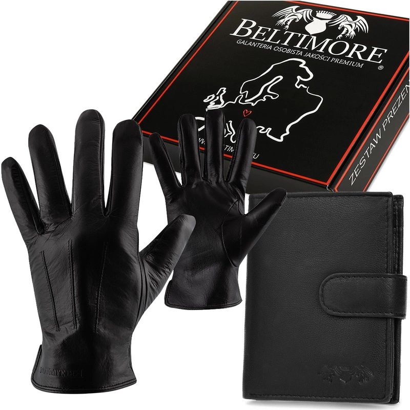 Ekskluzywny, wysokiej jakości, zestaw męski składający się ze skórzanego portfela oraz rękawiczek męskich w czarnym kolorze, zestaw marki Beltimore®