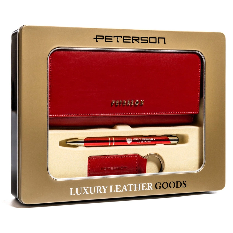 Zestaw prezentowy: duży portfel damski na zatrzask, skórzany brelok i czerwony długopis - Peterson