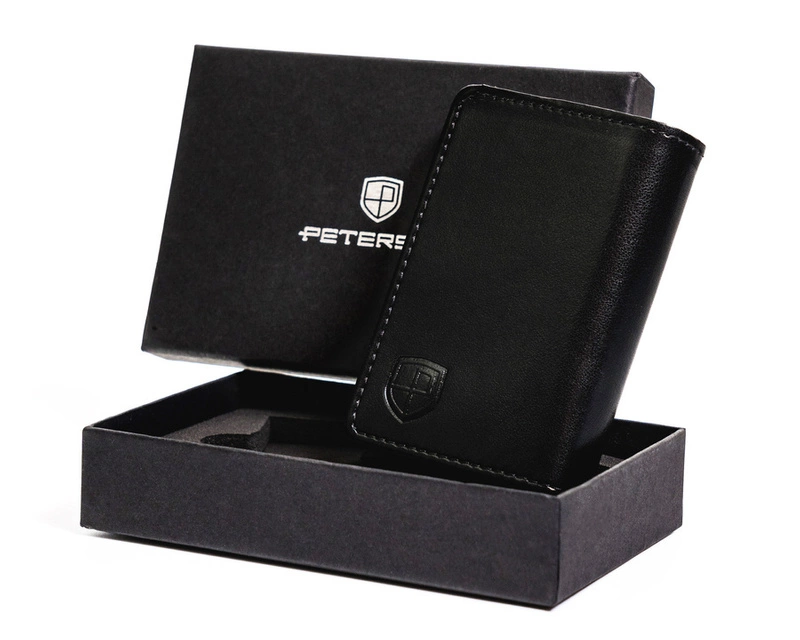Elegancki mały portfel polskiej marki PETERSON®. Wykonany został z wysokogatunkowej gładkiej skóry naturalnej. Zapinany na zatrzask. Na froncie wytłoczone zostało logo marki.