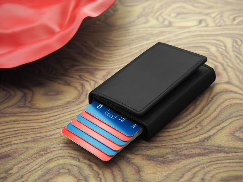Portfel wyposażony w ochronne etui na karty z inteligentnym systemem do ich łatwego wysuwania - wystarczy pociągnąć za małą dźwigienkę, a karty natychmiast się wysuną. Wykonano je z aluminium, chroni karty przed zgięciem, łamaniem oraz niechcianymi transakcjami zbliżeniowymi (technologia RFID BLOCKING SYSTEM)