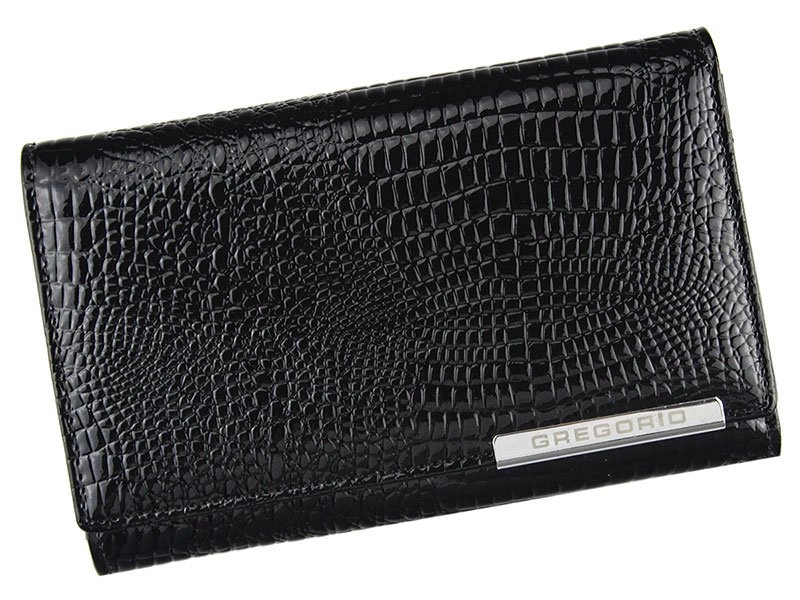 - Stylowy portfel, idealny dla kobiet z klasą. Wyjątkowa, lakierowana faktura z motywem skóry węża, krokodyla. Dodatkowo widoczne jest logo producenta Gregorio, na ozdobnej blaszce. Wzorowe wykonanie ze skóry naturalnej, która podkreśla piękny charakter.