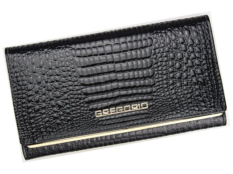 - Wyjątkowy portfel z oryginalną fakturą ze wzorem skóra krokodyla. Perfekcyjne wykonanie ze skóry naturalnej lakierowanej, na której widoczne jest jeszcze logo Gregorio. Model ten zamykany za pomocą wygodnego i trwałego zatrzasku.